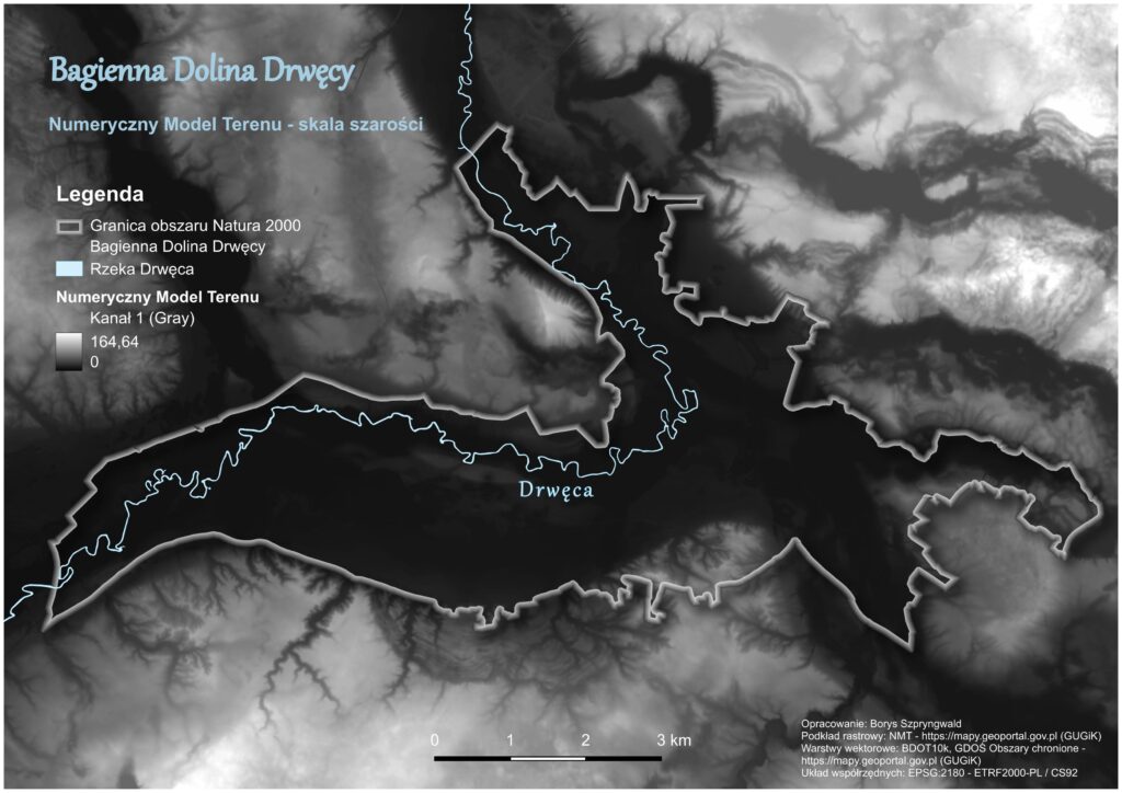 Jednak czasami warto zmienić perspektywę i spojrzeć nieco szerzej, żeby dostrzec ukryte piękno pozornie pospolitego miejsca. Dzisiaj jest to możliwe m. in. dzięki dostępności narzędzi geoinformatycznych oraz zobrazowań teledetekcyjnych. Poniższa mapa (Mapa 1) obszaru Bagiennej Doliny Drwęcy na tle numerycznego modelu terenu w skali szarości uświadamia, jak niezwykle złożone są ekosystemy dolin rzecznych. To wyrzeźbione przez lodowiec układy krwionośne natury, które przez tysiące lat kształtowały krajobraz i różnorodność biologiczną wokół nas.