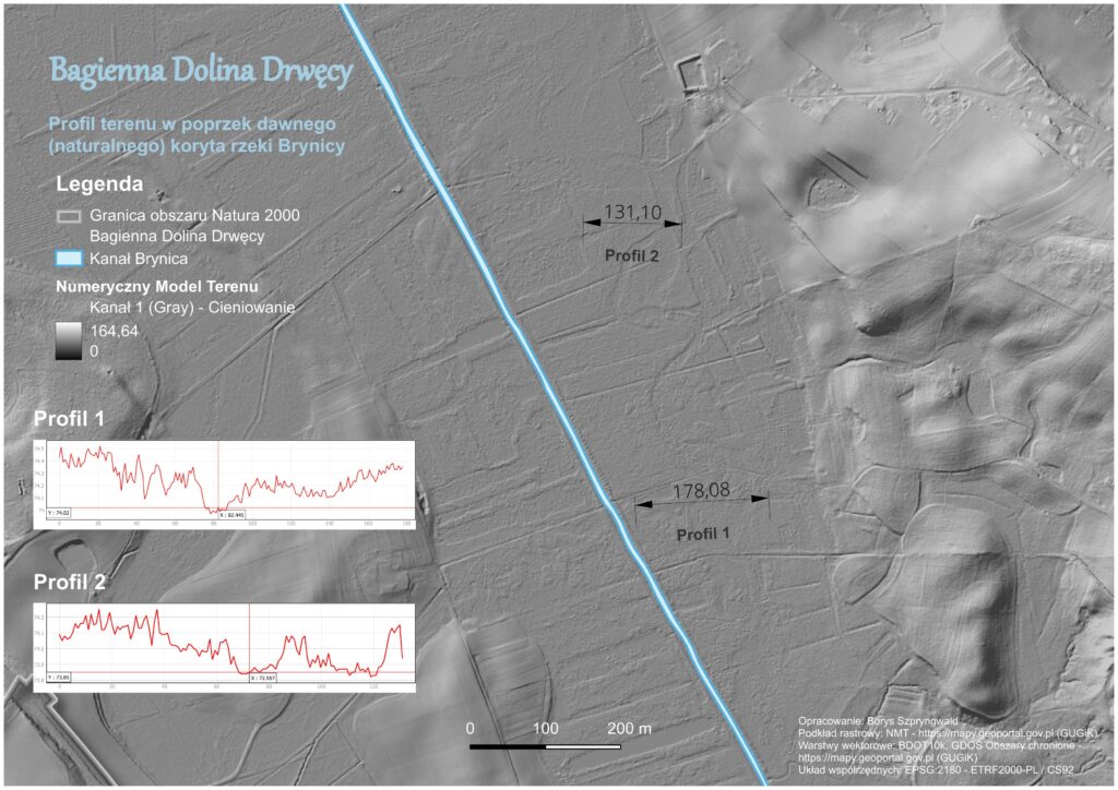 Na obszarze Bagiennej Doliny Drwęcy spotykają się trzy rzeki – Drwęca, Brynica i Samionka. Niestety Brynica i Samionka zostały skanalizowane i obecnie już nie płyną swoim naturalnym korytem. Zacząłem analizować NMT (Numeryczny Model Terenu) i okazało się, że dawne koryto rzeki Brynicy w jej dolnym biegu jest bardzo dobrze widoczne i łatwo można je zwizualizować. Wygenerowany profil terenu na kilku odcinkach poprowadzonych w poprzek doliny również wskazuje zagłębienie w miejscu dawnego koryta (Mapa 6).