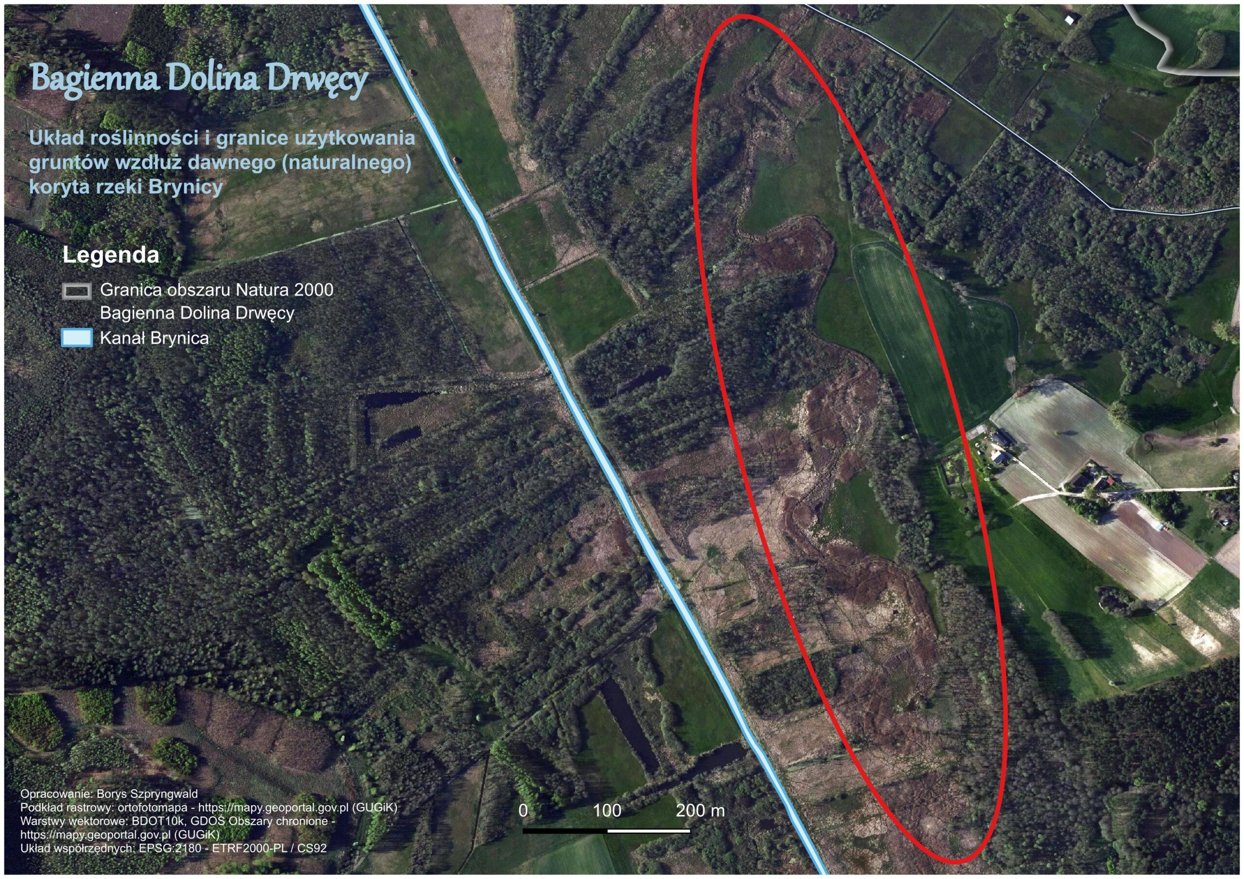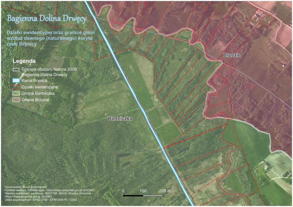 Zacząłem więc QGIS-owe geo-śledztwo, które doprowadziło mnie do kolejnych spostrzeżeń. Po podłożeniu aktualnej ortofotomapy można zauważyć, jak granice użytkowania terenu oraz układ roślinności pokrywają się z meandrującą, historyczną Brynicą. Kolejnym śladem są granice działek ewidencyjnych, obrębów ewidencyjnych i część granicy pomiędzy gminami Bartniczka i Brzozie, które niegdyś zostały wyznaczone wzdłuż dawnego koryta rzeki (Mapa 7 i 8).