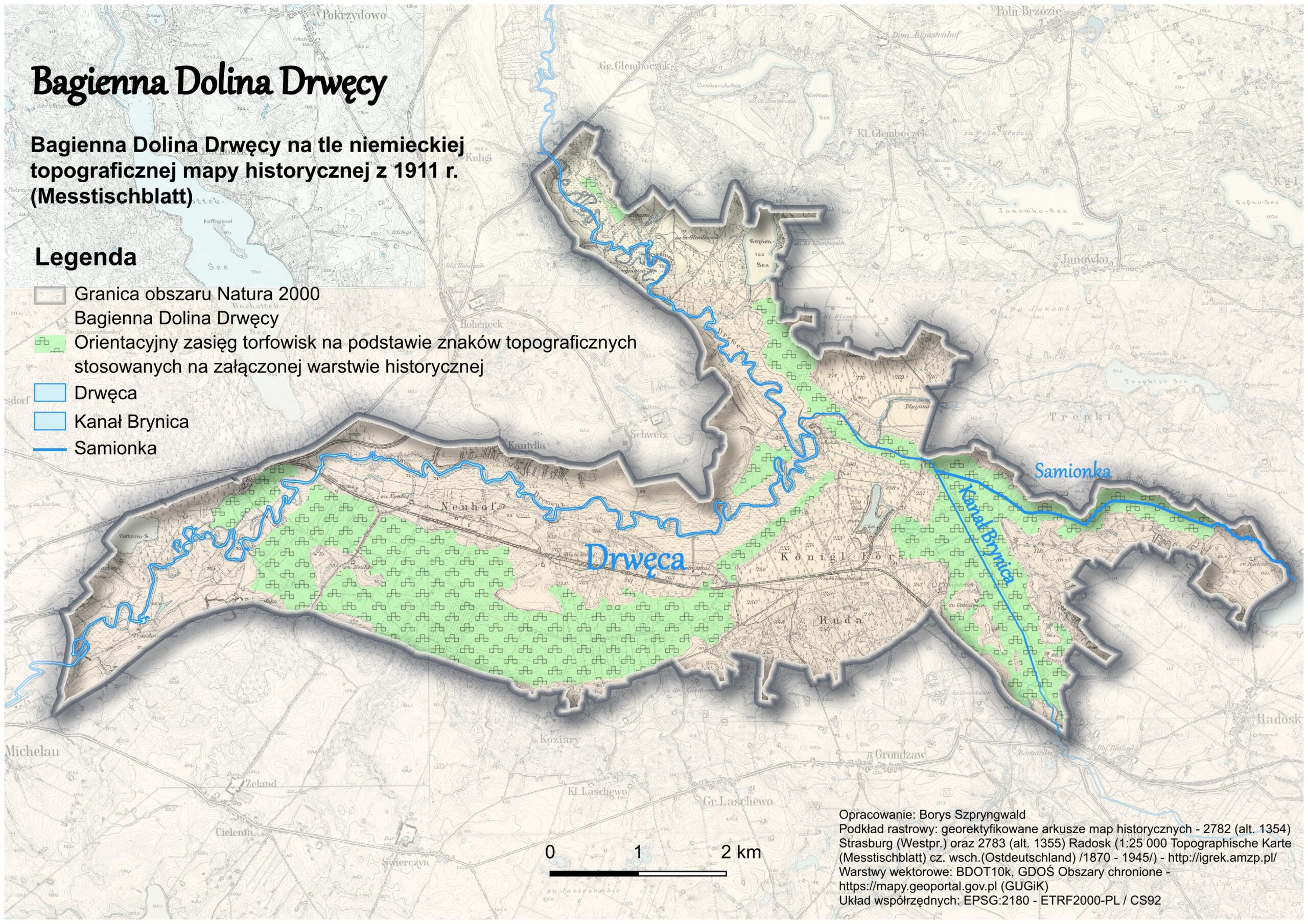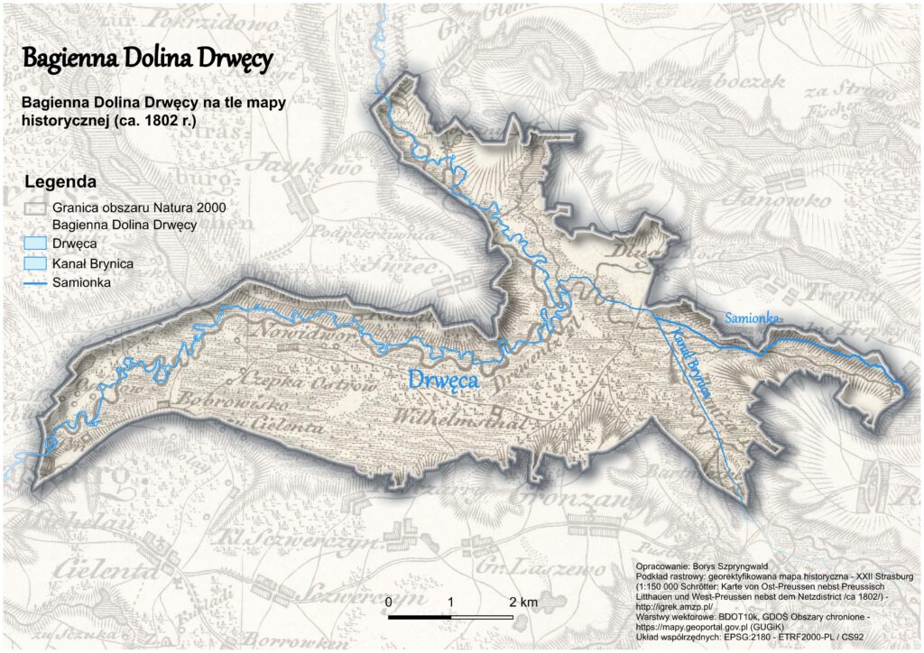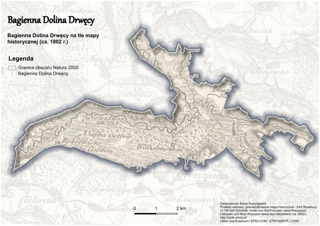 Odkąd na dobre pogrążyłem się przyrodniczo w mokradłach Bagiennej Doliny Drwęcy, próbowałem sobie wyobrazić jej oblicze sprzed wielkiej, melioracyjnej rewolucji na tym terenie. Sięgnąłem więc po stare, niemieckie mapy topograficzne z przełomu wieków XVIII i XIX oraz XIX i XX, które po odpowiedniej kalibracji umożliwiły porównanie ówczesnego wyglądu Bagiennej Doliny Drwęcy z jej dzisiejszym obrazem. Przy czym należy zaznaczyć, że mapy te znacząco różnią się poziomem dokładności i szczegółowości. Zwłaszcza messtischblatt w skali 1:25000 z 1911 roku zadziwia jakością i dokładnością odwzorowania terenu. Natomiast mapa Prus Wschodnich (tzw. mapa Schröttera w skali 1:150000) datowana na ca. 1802 rok, z uwagi na brak widocznych szczegółów użytkowania gruntów, pobudza wyobraźnię na temat możliwego wyglądu mokradeł Bagiennej Doliny Drwęcy w owym czasie (Mapa 2 i 3).