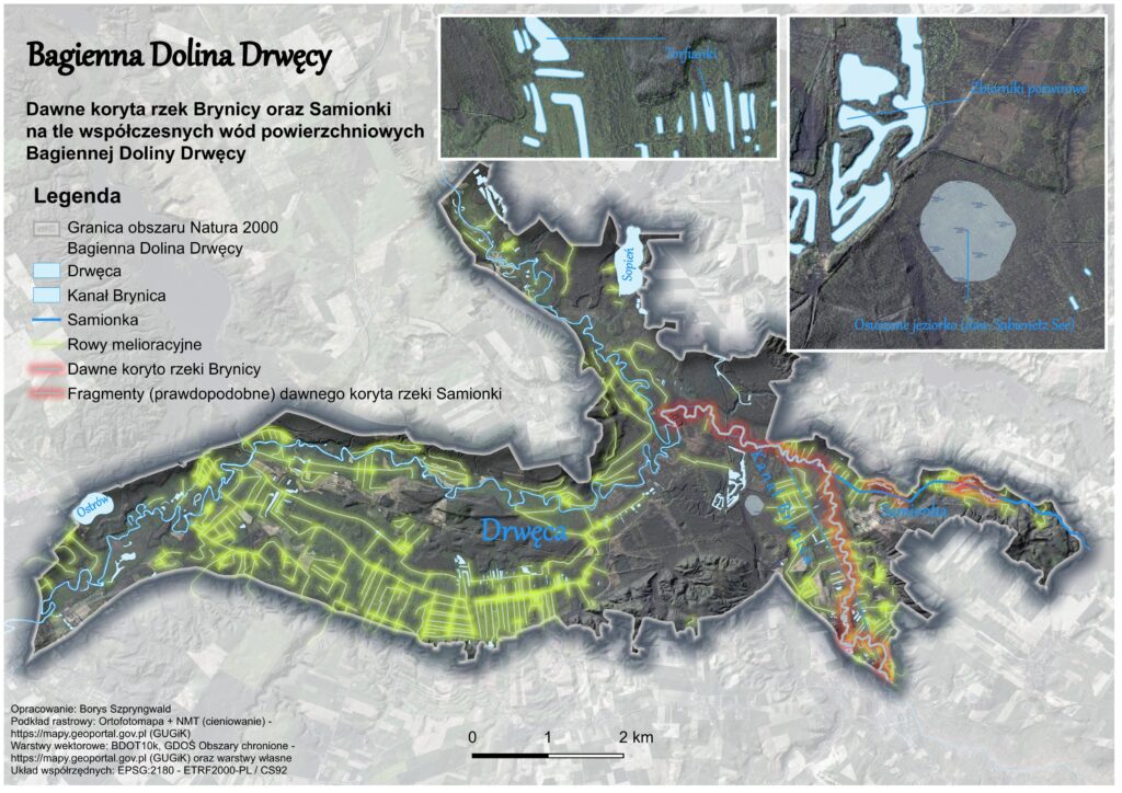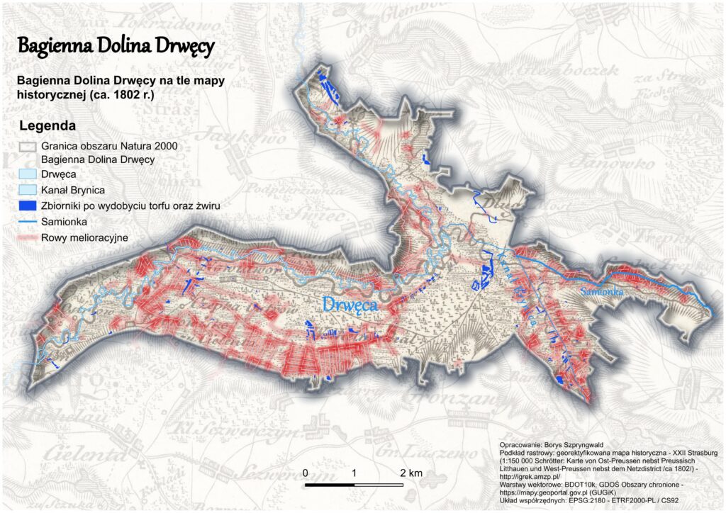 Żeby pokazać te przekształcenia, nałożyłem na wspomnianą wyżej mapę Schröttera z ca. 1802 roku obecną sieć rowów melioracyjnych o łącznej długości ok. 112 km oraz istniejące zbiorniki powstałe po dawnym wydobyciu torfu i żwiru (Mapa 5). Oczywiście część tych elementów związanych z działalnością człowieka stanowi obecnie ciekawe fitocenozy oraz ważne siedliska ptaków, ale jednak w szerszym kontekście odcisnęły one niekorzystne piętno na tutejszej przyrodzie.