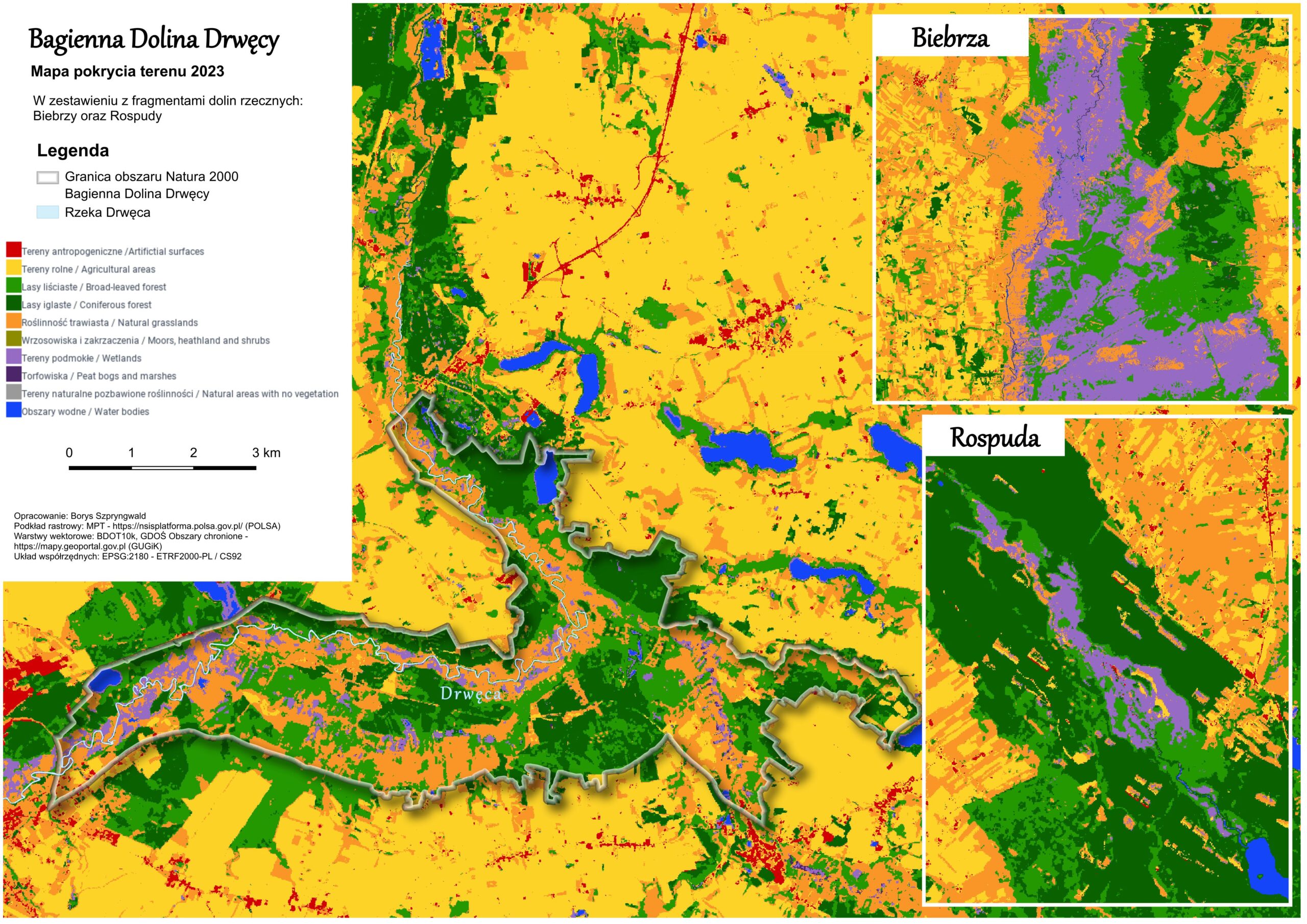 Poniżej, na tle mapy klasyfikacji pokrycia terenu z 2023 roku (POLSA – https://nsisplatforma.polsa.gov.pl – na bazie serii zdjęć zarejestrowanych w okresie wegetacyjnym), zestawiłem obszar Bagiennej Doliny Drwęcy z fragmentami dwóch najlepiej zachowanych obszarów naturalnych torfowisk niskich w Polsce – doliny Biebrzy i Rospudy. Można zauważyć wyraźną różnicę w udziale terenów podmokłych (kolor fioletowy) w stosunku do pozostałych kategorii gruntów na poszczególnych obszarach (Mapa 10). W ubiegłym roku miałem okazję zajrzeć wgłąb torfowisk doliny Biebrzy i Rospudy; to było niezwykłe przeżycie. Takich torfowisk na obszarze Bagiennej Doliny Drwęcy już po prostu nie ma.